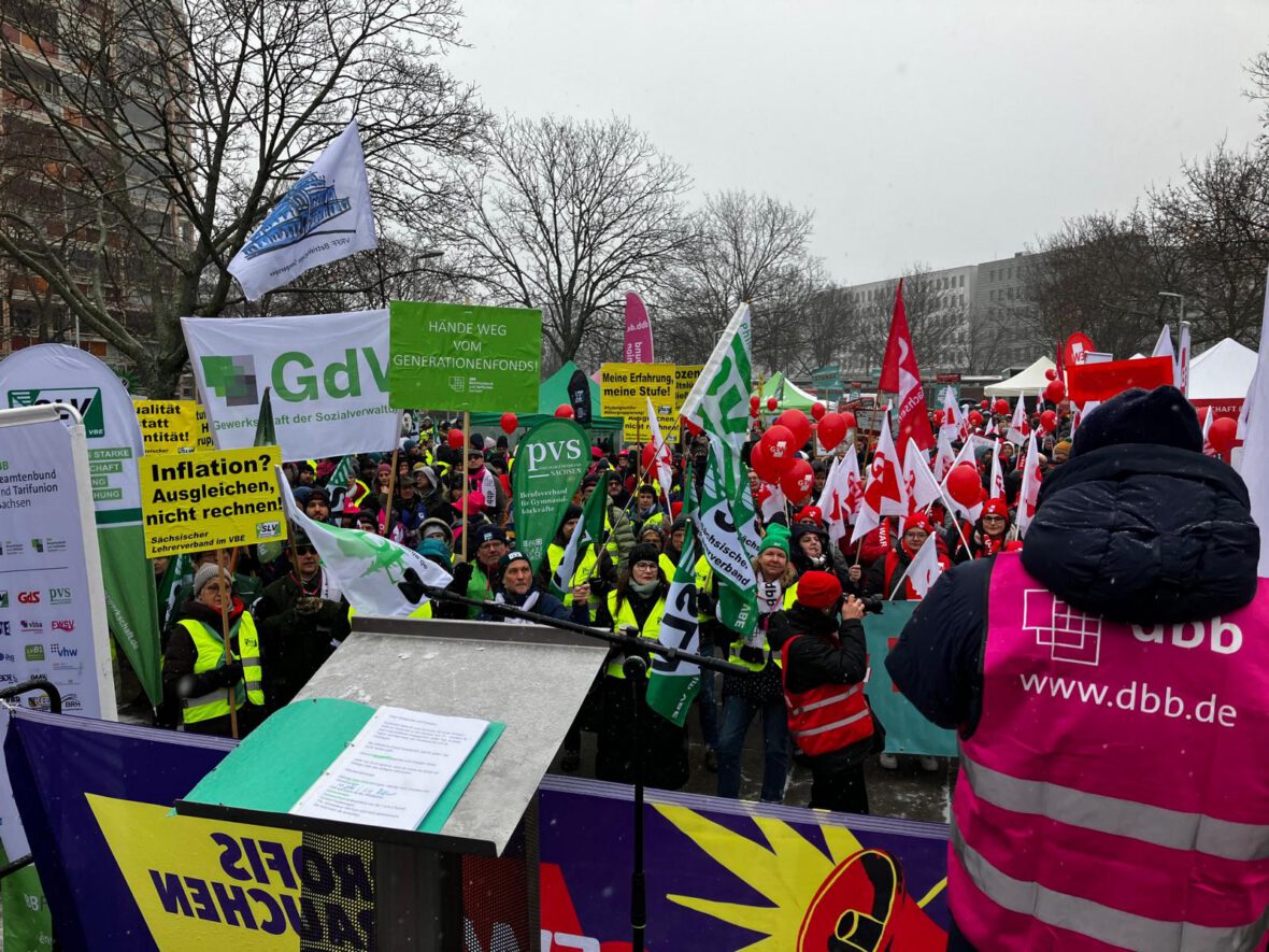 Die Kundgebung in Dresden organisierten der dbb beamtenbund und tarifunion gemeinsam mit dem Sächsischen Lehrerverband und dem SBB Beamtenbund und Tarifunion. In Leipzig waren der Deutsche Gewerkschaftsbund (DGB) und die GEW Sachsen federführend.