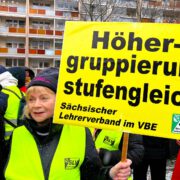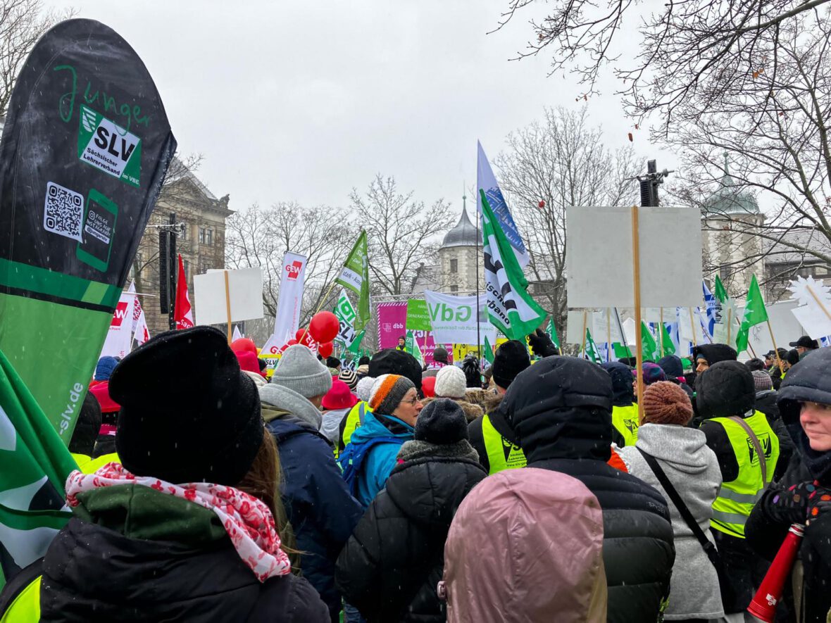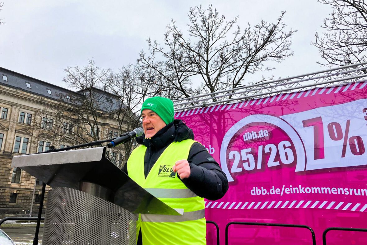 Auch SLV-Landesvorsitzender Michael Jung machte vor dem Finanzministerium in Dresden deutlich, dass die angekündigten Sparpläne der Staatsregierung in die falsche Richtung führen. Massive Kürzungen und Stellenabbau im öffentlichen Dienst verschärften die ohnehin angespannte Personalsituation – in den Schulen ebenso wie in anderen Bereichen der Landesverwaltung. Ein leistungsfähiger Staat brauche gut ausgestattete Einrichtungen und fair bezahlte Beschäftigte.