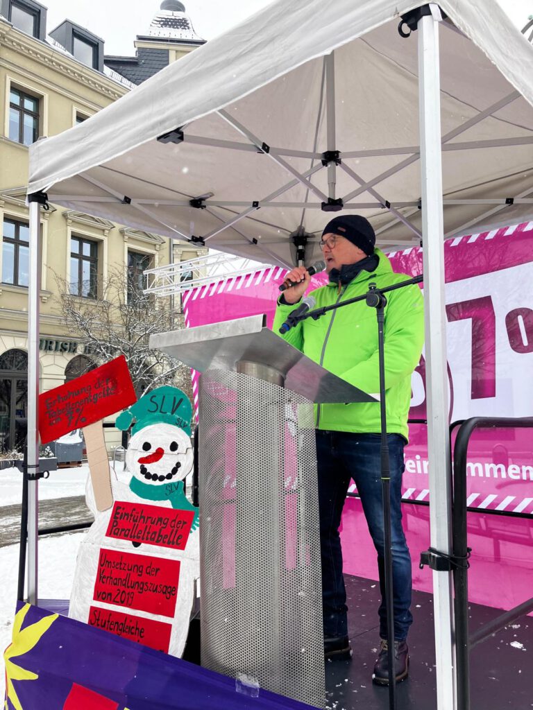 In Zwickau beteiligten sich mehr Lehrkräfte am Warnstreik, als an der Kundgebung teilnehmen konnten – nicht zuletzt wegen der extremen Wetterbedingungen. Das Engagement der Kolleginnen und Kollegen, die vor Ort waren, blieb dennoch ungebrochen.
